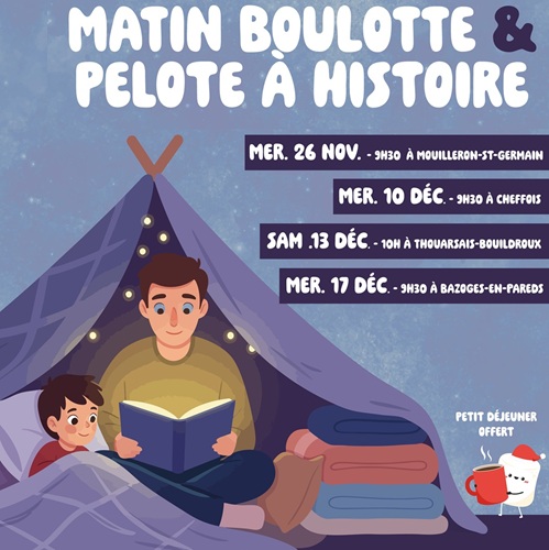 Matinée Boulotte & pelote à histoires : pyjama, petit-déj & histoires ! Le mercredi 10 décembre 2025 de 09:30 à 11:30 Lieu Cheffois Condition d'accès gratuit, à partir de 6 ans, venir en pyjama - petit déjeuner offert ! Public Enfants Matinée Boulotte & pelote à histoires : pyjama, petit-déj & histoires !