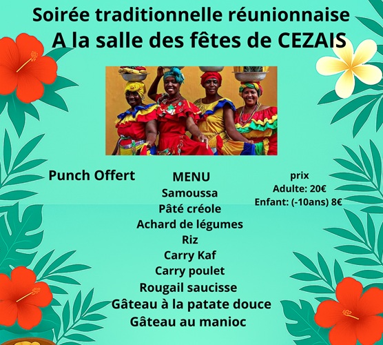 Soirée traditionnelle réunionnaise à Cezais Le samedi 20 décembre 2025 à 19:00 Lieu Cezais Condition d'accès Sur inscription jusqu'au 19 décembre Public Tout-public Soirée traditionnelle réunionnaise à Cezais