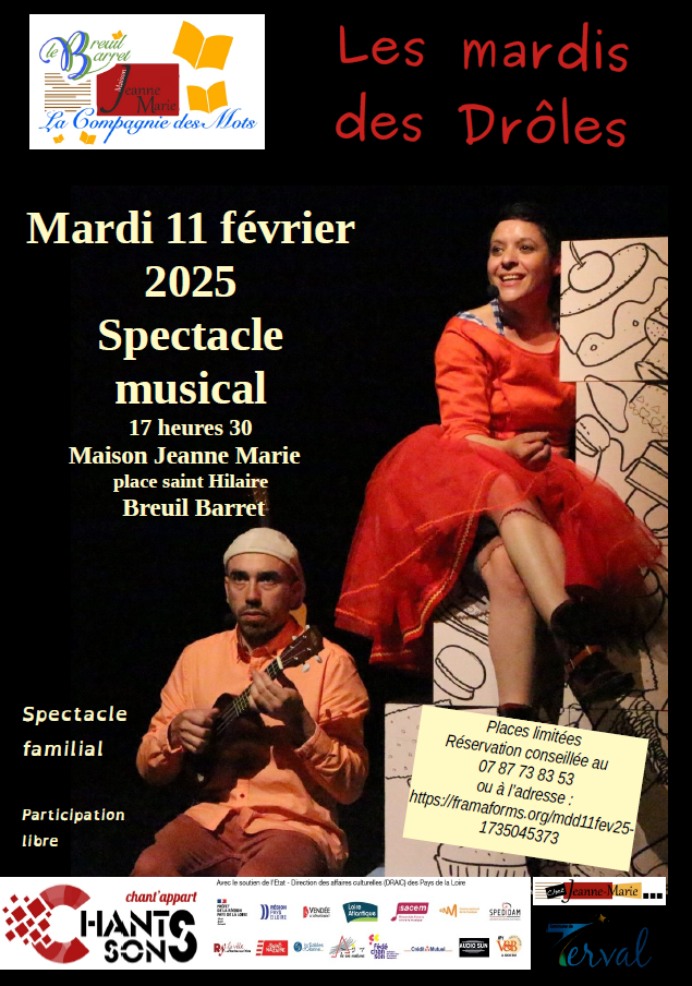 Les mardis des drôles au Breuil-Barret : spectacle musical "Chant'appart", mardi 11 février à 17h30 Afficher les options de partage × Partager Détails des prochaines sessions Aucune prochaine date