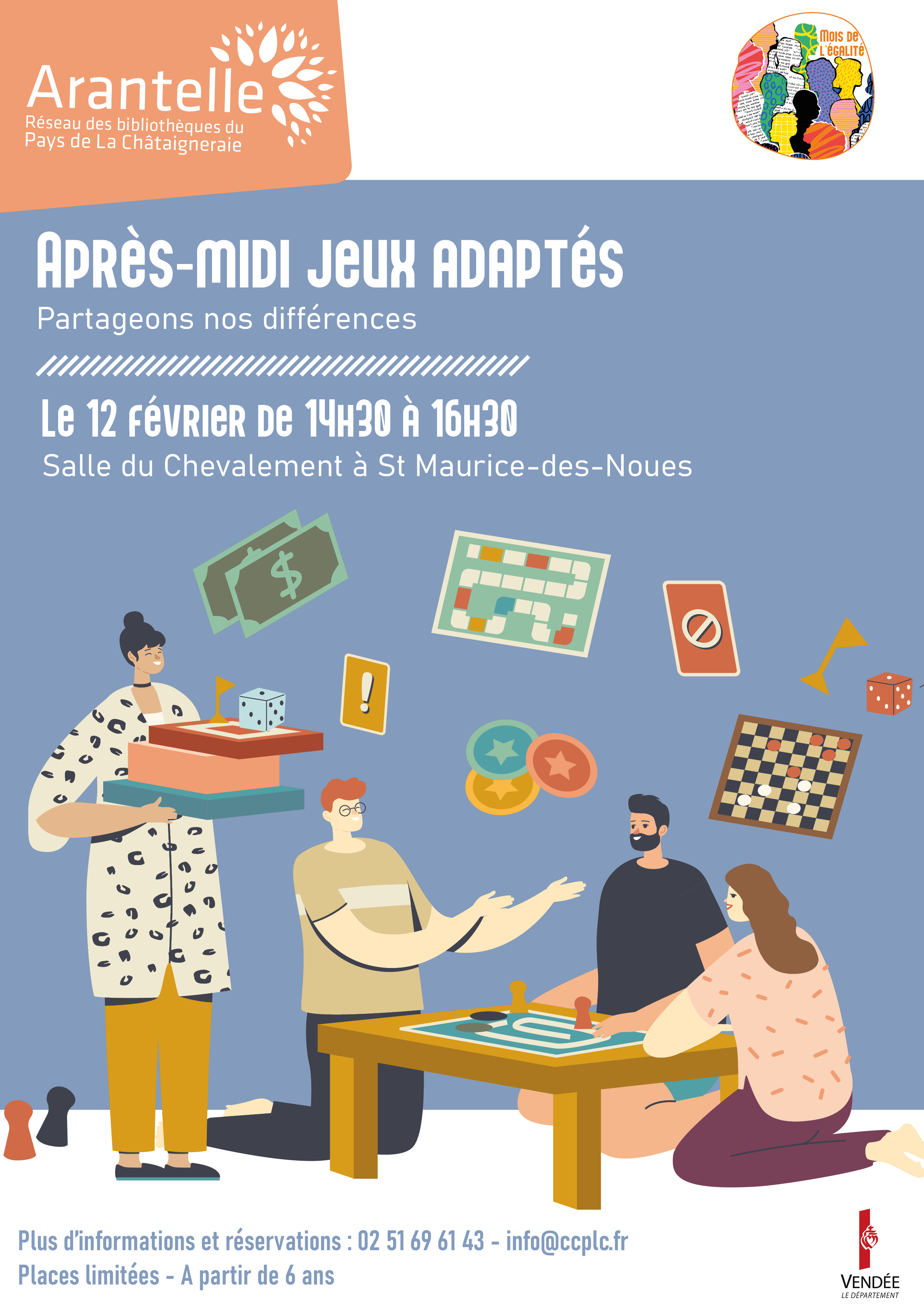 Dans le cadre de l'action "Partageons nos différences" en partenariat avec le département de la Vendée, on vous invite à profiter d'un chouette moment de bonne humeur seul(e), en famille ou entre amis lors de nos séances de jeux de société adaptés.