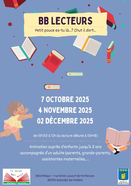 Matinées « bébés lecteurs » à Bazoges-en-Pareds Afficher les options de partage × Partager Détails des prochaines sessions Le mardi 04 novembre 2025 de 10:30 à 12:00 Lieu Bazoges-en-Pareds Public Tout-petits Le mardi 02 décembre 2025 de 10:30 à 12:00 Lieu Bazoges-en-Pareds Public Tout-petits