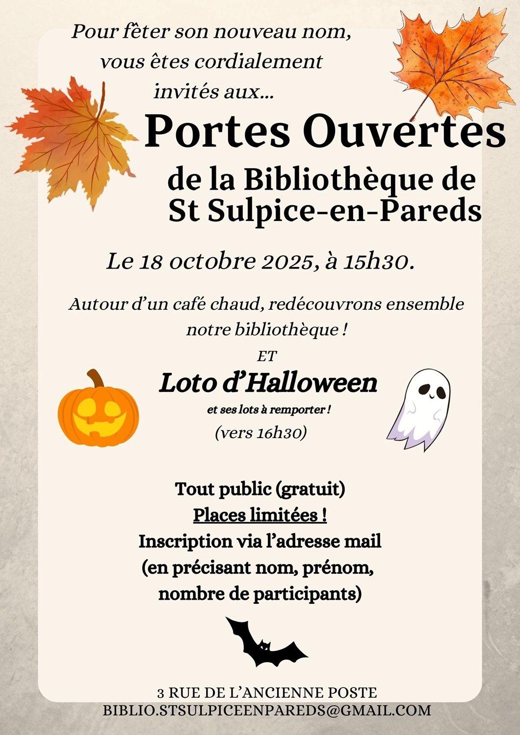 Portes ouvertes de la bibliothèque de Saint Sulpice en Pareds - Rives du Fougerais Afficher les options de partage × Partager Détails des prochaines sessions Le samedi 18 octobre 2025 de 15:30 à 17:30 Lieu Saint Sulpice-en-Pareds Condition d'accès Gratuit, tout public, places limitées : inscription par mail auprès de la bibliothèque de Saint Sulpice : biblio.stsulpiceenpareds[at]gmail.com Public Tout-public