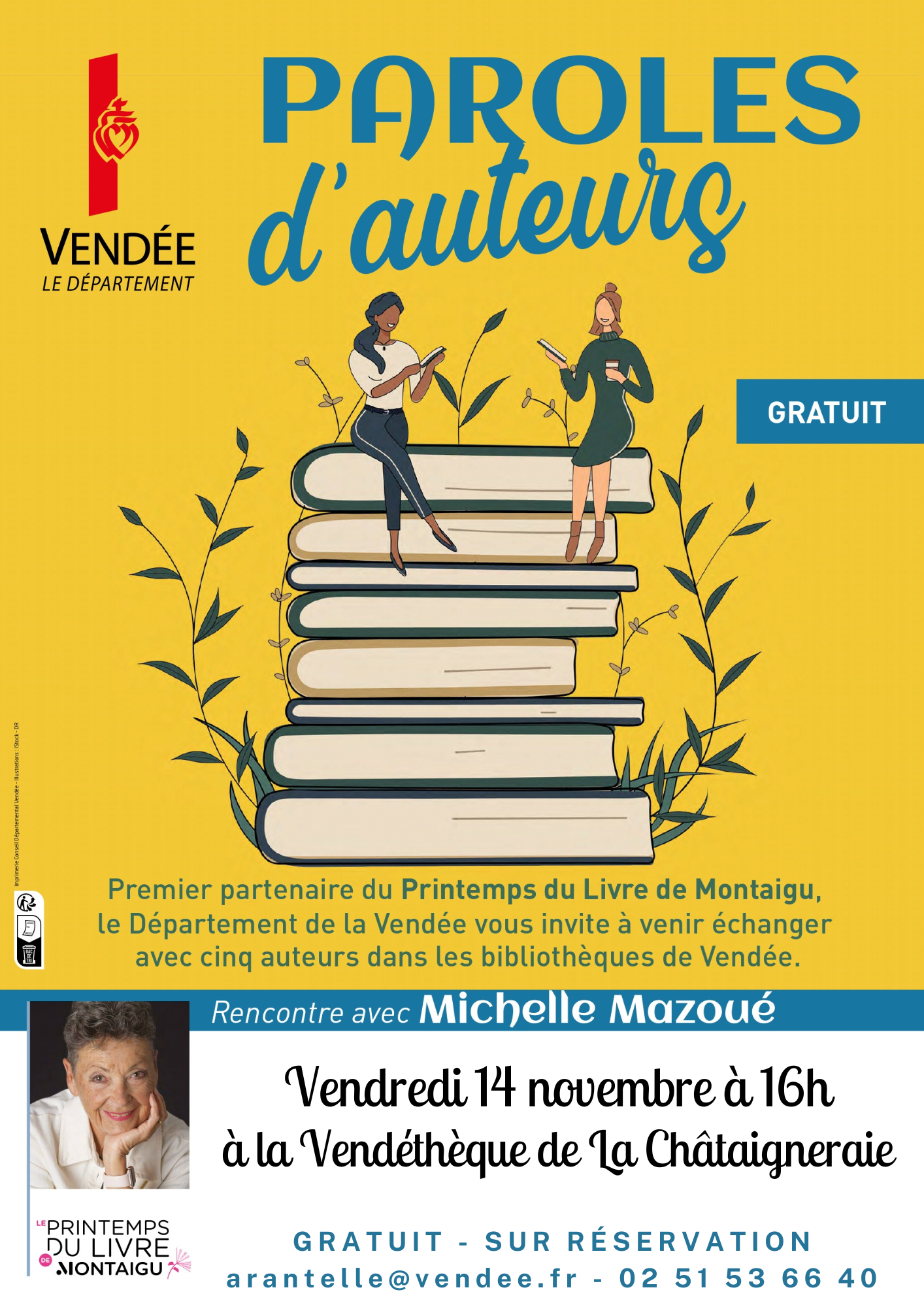 Dans le cadre de l’opération « Paroles d’auteurs », le Département de La Vendée vous invite à venir rencontrer la romancière Michelle Mazoué à la Vendéthèque de la Châtaigneraie.