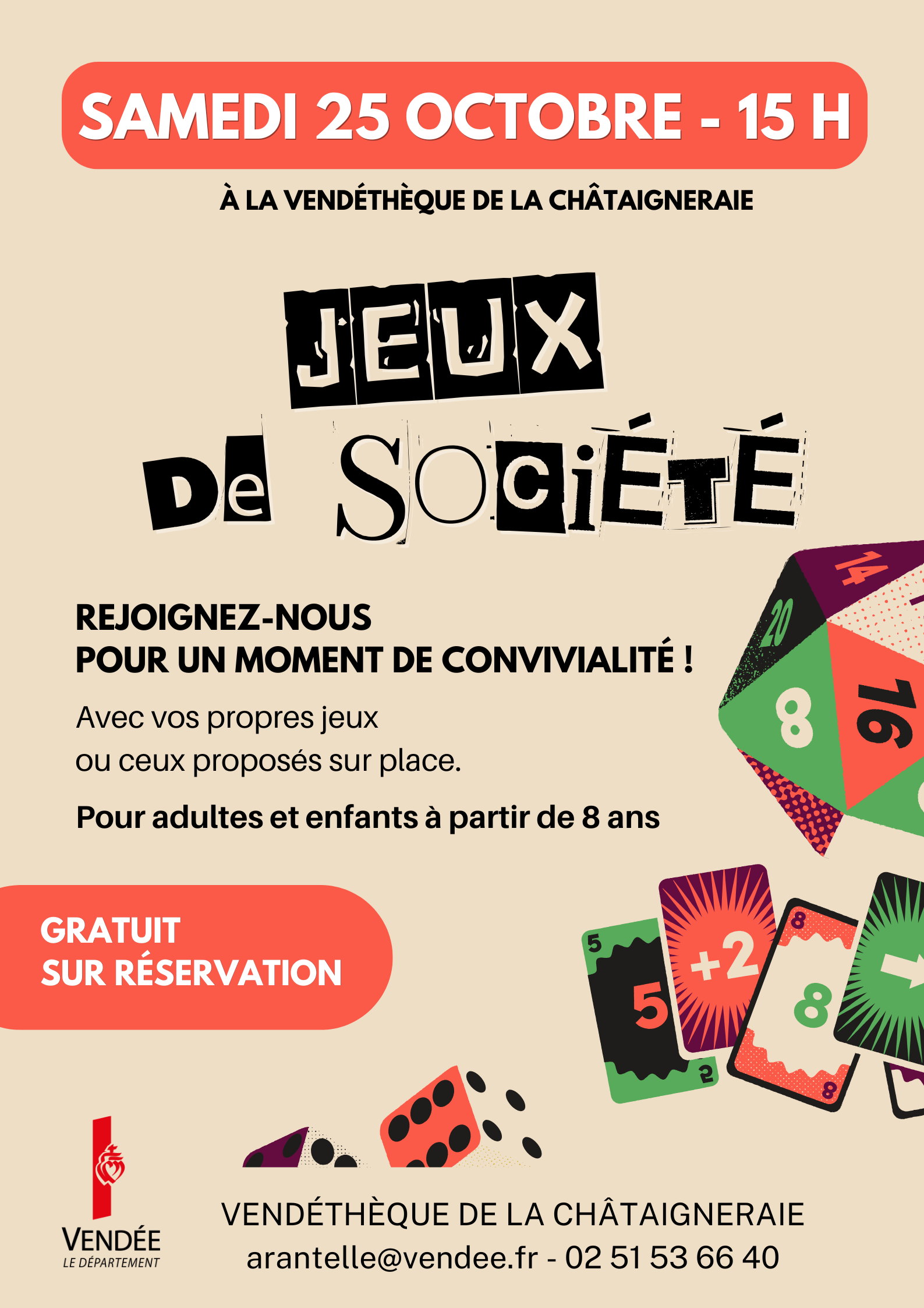Rendez-vous le samedi 25 octobre à La Vendéthèque de La Châtaigneraie pour des séances de jeux de société ouvertes à tous