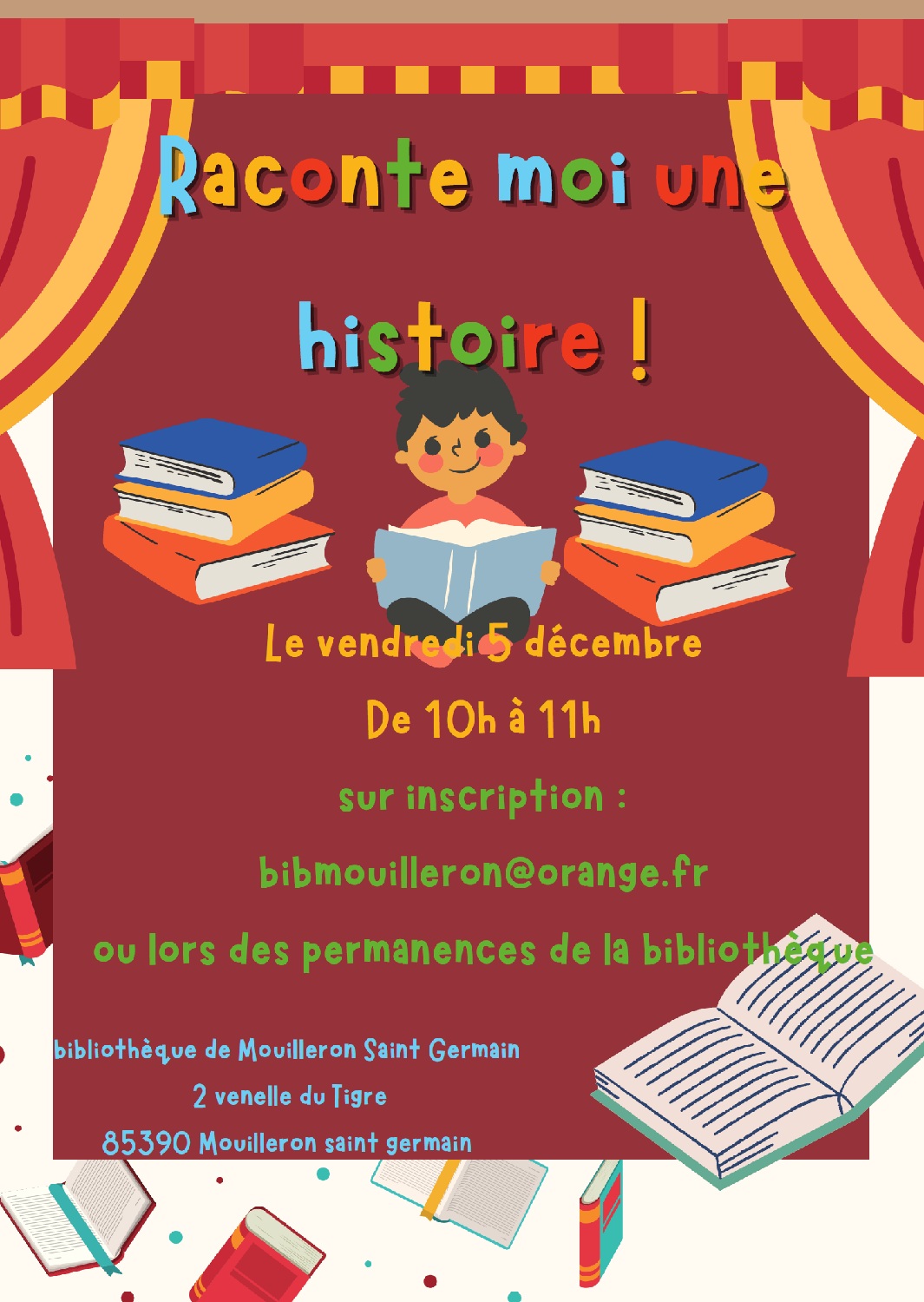 Raconte-moi une histoire : séances bébés lecteurs à Mouilleron Saint Germain Afficher les options de partage × Partager Détails des prochaines sessions Aucune prochaine date