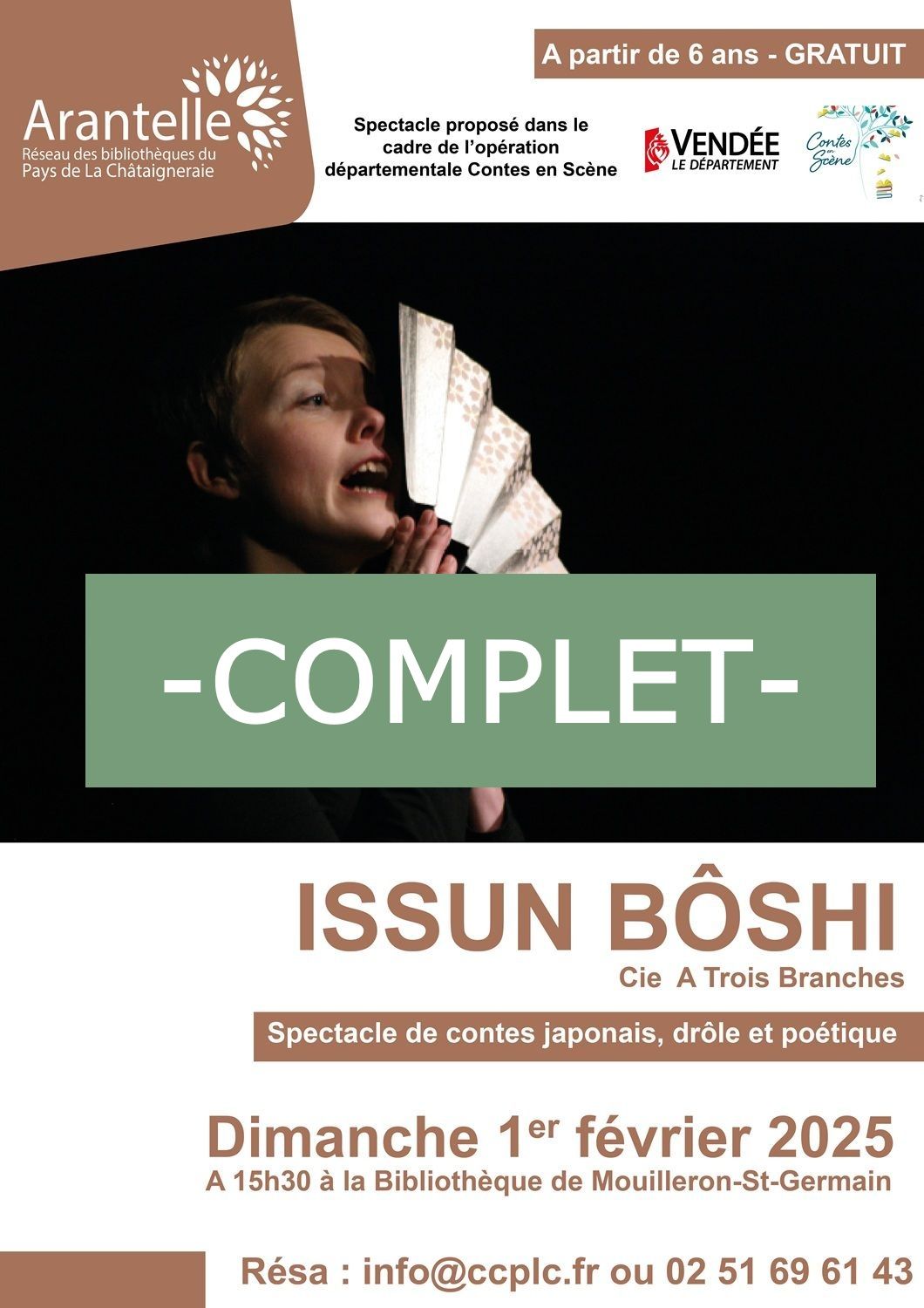 Dans le cadre de l’opération départementale Contes en Scène, Arantelle recevra le spectacle Issun Bôshi, de la Compagnie À trois branches avec l’artiste Edwige Bage. Le dimanche 1er février 2026, à 15h30 à la bibliothèque de Mouilleron Saint Germain.