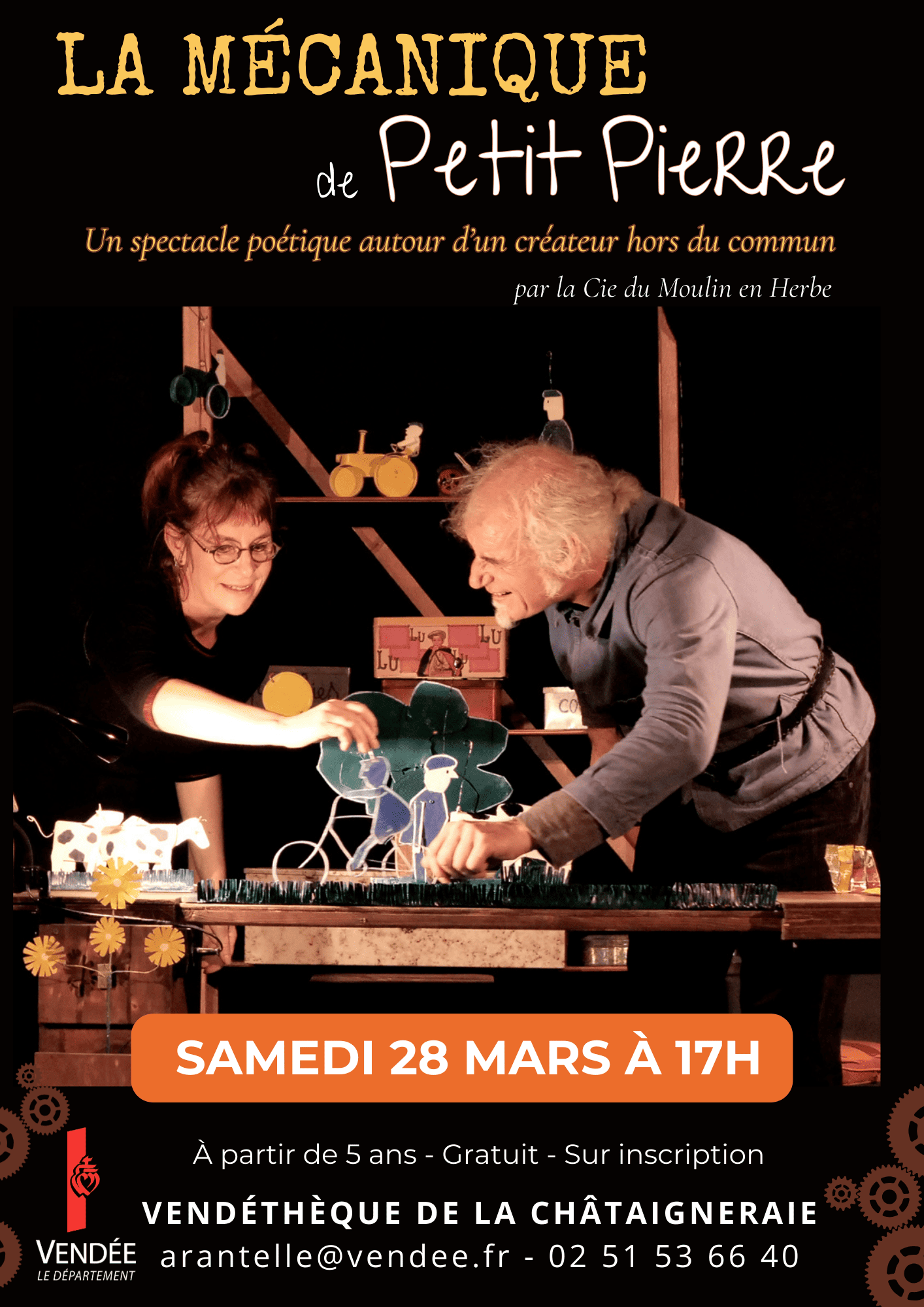 Le Département de la Vendée vous propose une expérience unique et poétique avec « La Mécanique de Petit Pierre », le samedi 28 mars à 17h à la Vendéthèque de La Châtaigneraie.